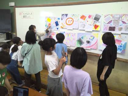 5年生の図画工作科で心のもようを表現した絵画の鑑賞を行いました。自分と似た色を使っていても形が違うなど、どんなもようを表したのかを自然と聞き合っていました。友だちの良かったところはロイロノートでまとめました。