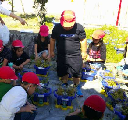 今日は2年生の生活科でミニトマトを植えました。自分の植木鉢に生えていた野草を抜いて準備するところから始めました。自分で考えて、根っこから上手に抜いていました。