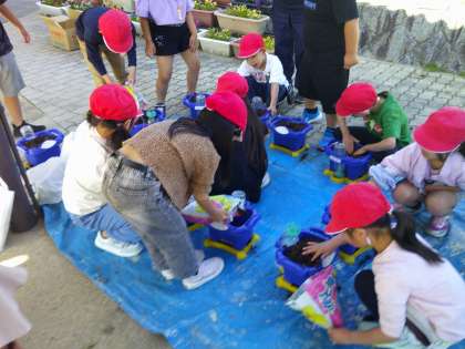 次は新しい土を入れました。あまり周りに土を落とさずにきれいに入れることができました。これもどうすればうまく入れられるかなということを考えていれることが大切です。