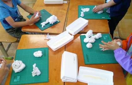 今日の図工はねんどでつくろう なにつくろうというテーマでイメージしながら作りました。丸める、にぎる、のばす、たたくなどいろいろなやり方でつくりました。
