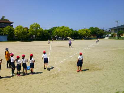 今日はソフトボール投げをしました。日常生活の中で投げる動きをしているひともしていない人もいたようですが、一人ひとり力いっぱいなげていました。
