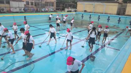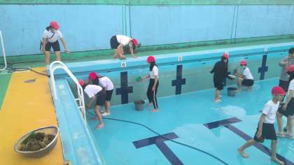 水泳学習に向けて6年生がプール掃除を行いました。みんなで声を掛け合いながら、学校全体のために楽しみながらも一生懸命に掃除する姿が素敵でした。