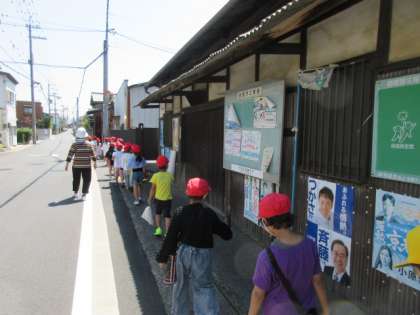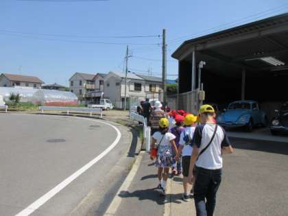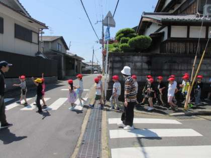 細い道は1列で歩き、横断歩道を渡るときには、左右をよく見ることに注意して歩きました。