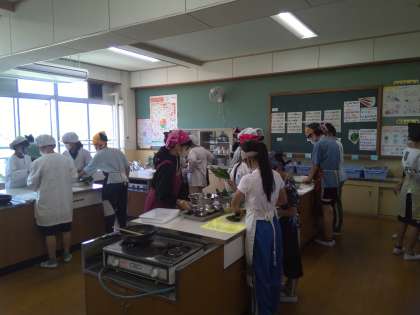 調理実習で青菜を炒めました。青菜を切り、茎から炒めることで全体に火が通るようにしていました。