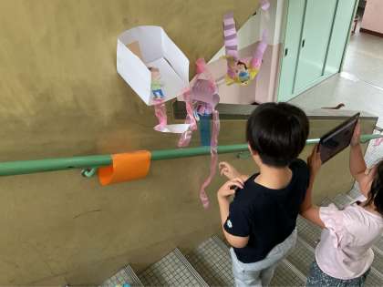 今日の図工では、見慣れた場所の新しい面白さをみつけて、その場所に楽しいすみかを作りました。