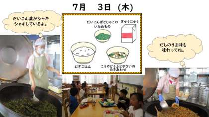 今日の献立は、麦ごはん・牛乳・高野豆腐と野菜のたき合わせ・だいこん葉とじゃこのいためものです。だしのしみた高野豆腐は、干ししいたけのうま味もごはんとよく合います。だいこん葉とじゃこのいためものは、シャキシャキした食感やごまの香ばしさも楽しめます。