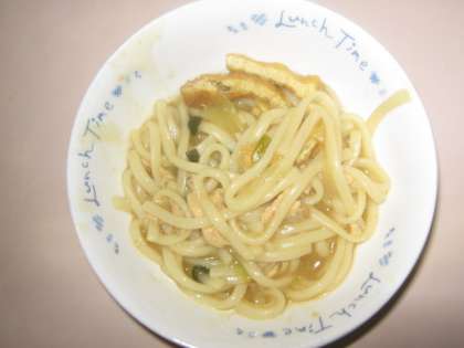 本当はカレーうどんのうどんだけで,主食の量をとりたいのですが,今の食缶や食器に入る量に限界があり,減量ごはんとの組み合わせになっています。