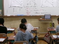 今日は四角形の内角の和について、対角線を引いて三角形を作りそこから考えました。三角形が4つあって180度×4で720度となりますが、対角線と対角線が交わる点つまり三角形の頂点が4つ集まったところは一周になるので360度と考えます。四角形の内角の和を考える時には720度から360度を引くことになるので、引くと360度となり、四角形の内角の和は360度になることがわかります。対話も交えて考え方を交流していました。