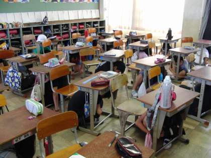 「避難します!」の放送で、ヘルメットを着用し、すみやかに避難をはじめます。