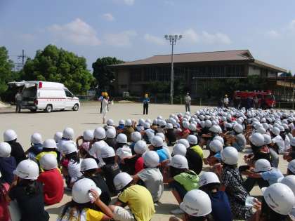 避難後、教頭先生、救急隊の方のお話を聞き、町別に整列し、避難訓練を終えました。