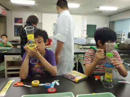 6年生ははじめに実験室で「エコーマイク」を作る実験学習をしました。