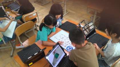 音楽科の学習では、校内で見つけた音を動画で撮影しました。「ドアを開ける音」「バケツの音」など様々な音を見つけました。グループになりその音をつなぎ合わせて音楽にしました。「ドンドンガチャガチャピー」など面白い音楽ができあがりました。