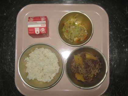 8日(金)の給食は,『ごはん・牛乳・肉じゃが・ごま酢煮』でした。