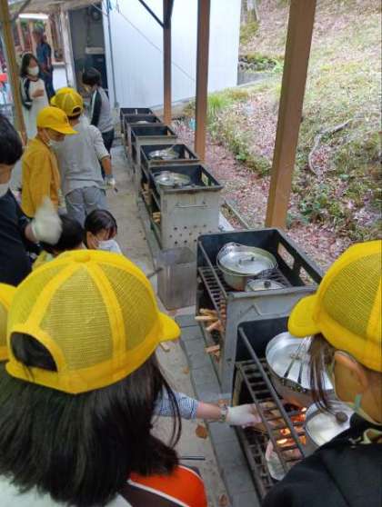 野外炊事の様子です。かまどに火がつきました。