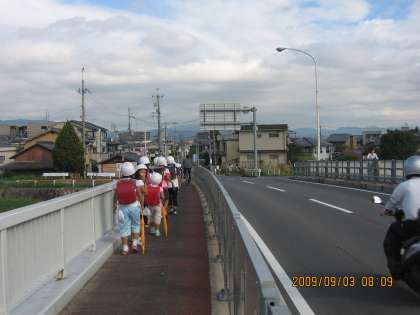 本校では,遠い道のりを安全に登校できるように,班長を先頭に2列になり,集団登校をしています。しかし,長さ250メートルの淀大橋の歩道は,幅が2メートル程で,1列でなければ自転車の方などのめいわくになることがあります。班長は,他の通行人に気を遣いながら,橋の歩道では広がることなく,班の子どもたちをひきつれています。