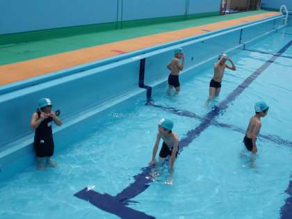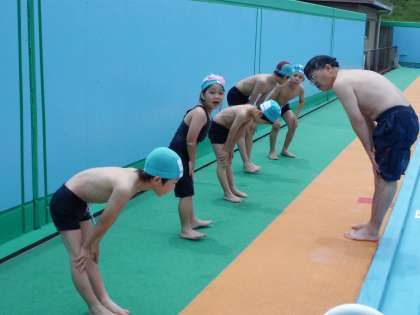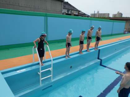 今日はプールが低水位なので,水泳のきまりや体操の仕方を確かめ,水なれをしました。