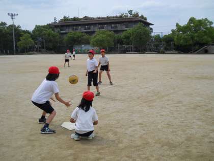 体育のハンドベースボールの学習ではチームプレーのよさに気付き,チーム内でいい声かけができるようになってきました。