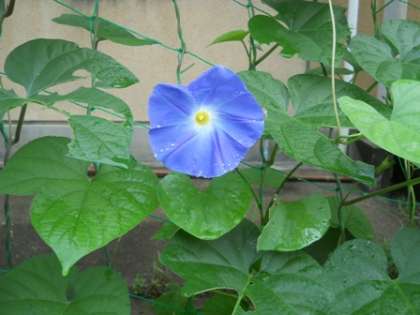 オーシャンブルー(朝顔の一種)に引き続き,今朝,ヘブンリーブルー(朝顔の一種)の花が咲きました。校舎南側の朝顔は,すくすくと育っています。