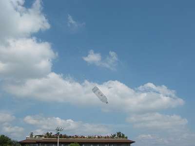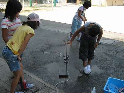 ペットボトルロケットは最初なかなか飛ばず,「どうやったらとぶんやろう??」「水をもっと入れてやってみよ!」と子どもたちは試行錯誤を繰り返していました。コツをつかむと,次々にポンポン飛ばし,二階あたりまで飛んだ時は先生も歓声をあげるほどでした。