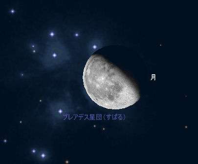 ★9月10日から11日にかけて、月齢21の月がプレアデス星団(M45、すばる)を隠します。月が明るく肉眼での観測は難しいそうです。が,双眼鏡や望遠鏡で、月の暗い縁から星団の星が次々に現れてくるのを楽しむことができるかもしれません。