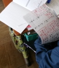 楽譜を見ながら,おのおのの楽器の練習をしています。