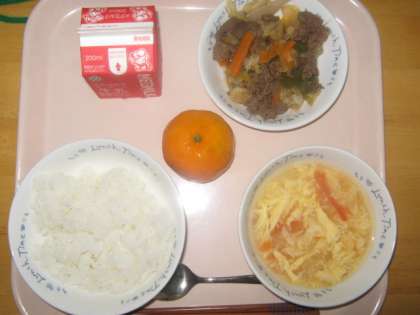 今日に給食は,『ごはん・牛乳・焼き肉・トマトと卵のスープ・みかん』です。