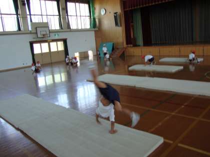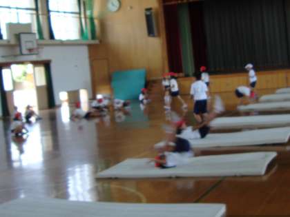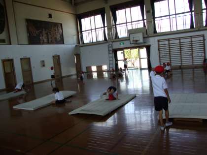 夏休み明けから週に一時間,体育でマット遊びをしています。マットを二枚つないで連続技を練習したり,踏切板をマットの下にひいて坂道にしたりいろんな練習場所を設定して様々な技にチャレンジしています。前転・後転だけでなく2年生では側転や開脚前転にも挑戦しています。側転は幼稚園・保育園で練習した子も多く,足先まで伸びた鮮やかな側転を決めてくれる子が何人もいます。開脚前転は初めての子が多くぎこちない感じですが徐々に練習していこうと考えています。