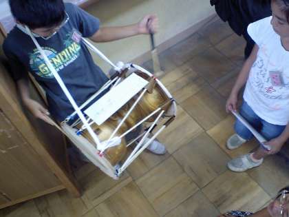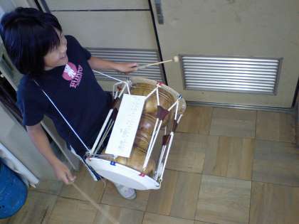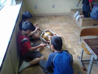 韓国の楽器「チャング(チャンゴ)」の体験をしました。2種類のばちに四苦八苦しながら,楽しく演奏しました。