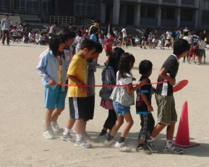 1年から6年生のたてわりグループが1本の紙テープの中に入り、リレーするゲームを楽しみました。