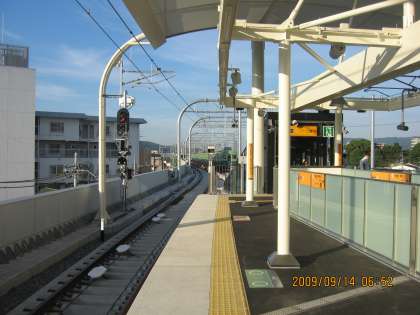 おはようございます。9月12日土曜日,京阪電車 淀駅の下りホーム(大阪方面行)が新しくなりました。まだ真新しい建物の香りが残っています。改札口は従来よりも100メートルあまり南に移り,学校から近くなりました。