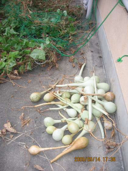 みどりのカーテンも終盤へ。ヘブンリーブルー(朝顔の一種)が盛んなところを残して,カーテンを下ろしました。もっとも,ヒョウタンの収穫のためでもあるのですが…。ご覧のようにツルクビヒョウタンがテンコ盛りです。学級で何かできればいいのですが。