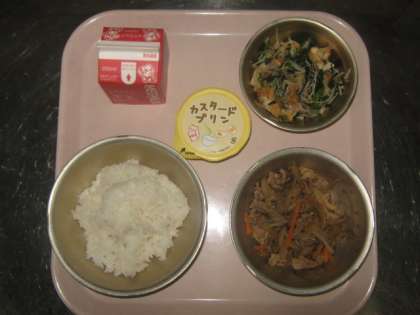 今日の給食は,『ごはん・牛乳・豚肉とごぼうのみそいため・もやしの煮びたし・プリン』です。