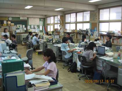 平成18年度に校内LANが整備された本校では,職員会議や研修会,研究会などを職員室で行っています。教職員はノート型コンピュータのモニターを見ながら,会議に臨んでいます。職員朝会も基本的に月曜日だけにして,後の日はPC上の「職朝の書き込み」(今日の予定)に連絡事項などを書き込んで,情報を共有しています。