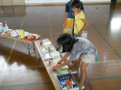 夏休みに頑張った工作・絵画・自由研究などを一同に集めた,「夏休み作品展」が体育館で開かれています。