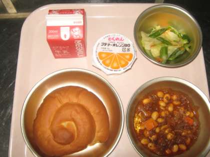 「チリコンカーン」は,豆を使った南米のお料理で,給食風にアレンジしています。やわらかく煮た大豆と牛ひき肉・たまねぎ・にんじんをコトコト煮込みました。カレー粉やケチャップ以外にも,いろいろ香辛料を使っています。みんなの好きな味つけで,今日も残菜ゼロでした。