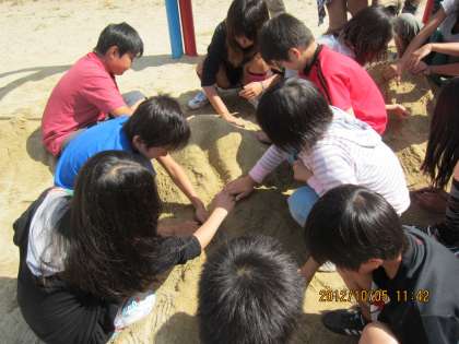 5年生は現在,理科の学習で「流れる水のはたらき」を行っています。そして今日の理科の学習は,砂場での実験・観察でした。まず,砂場に大きな山を作るのですが,みんな目的を忘れているかのように楽しそうに大きな山を協力して作っていました。その後,その山に,くねくねした道や直線の道をつくり,水を流すとどのように流れ,どのようなはたらきがあるのかを観察しました。子どもたちは,とても楽しそうに,そして流れていく水の様子を一生懸命観察し,流れる水のはたらきについて学ぶことができていました。