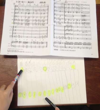 木琴を強く希望している子が,ノートに木琴を書いて,そして,ペンをもって,木琴の練習をしているではありませんか!
