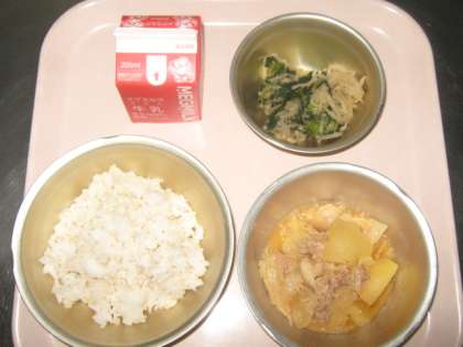 今日の給食は,『麦ごはん・牛乳・肉じゃが(ピリカラみそ味)・小松菜と切干大根の煮びたし』です。