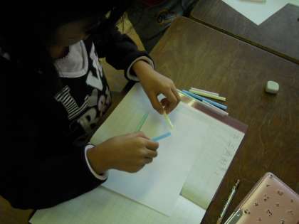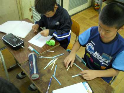 1時間目の今日は,ストローを辺にしていろいろな三角形をつくり,辺の長さに注目して種類わけをしました。