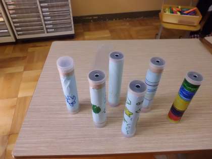 筒に飾りを入れ,穴から見てみると,美しい模様が見え,「うわー,きれい。」と言ってすごく喜んでいました。