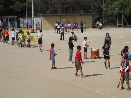 朝の時間に応援練習。教室に色別で集まり6年生を中心に大きな声を出しています。中間休みにも,太鼓を使い応援練習。「赤勝て,黄勝て,青勝て」とみんなで身振り手振り,一生懸命頑張っています。