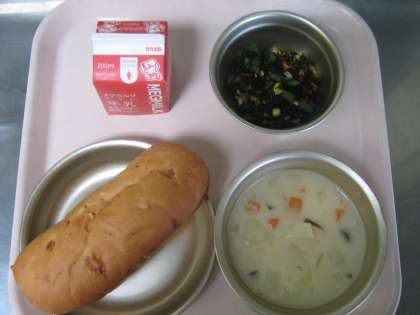 今日の給食は,『チーズコッペパン・牛乳・きのこのクリームシチュー・ひじきのソティ』です。