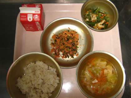 今日の給食は,『さけと大根葉のまぜごはん・牛乳・三度豆の煮つけ・キャベツの吉野汁』です。