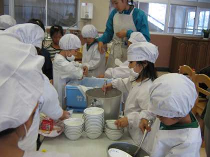 今日は1年生がランチルーム給食でしたが,上手に配膳して,残さず食べていました。