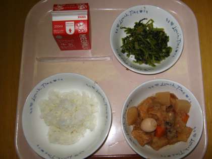 今日の給食は,『ごはん・牛乳・関東煮・大根葉のごまいため』です。