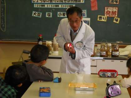 国語科「すがたを変える大豆」の学習と関連付けて,今日は日本醤油協会から博士に来ていただき,しょうゆの香り・色・味のひみつを教えていただきました。