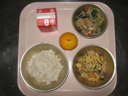 今日の給食は,『麦ごはん・牛乳・高野どうふの卵とじ・もやしの煮びたし・みかん』です。
