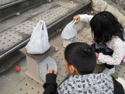 ビニール袋に砂を詰め,ぴったり1kgを作ります。