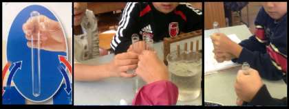 ◇いろんなことがわかりました。たとえば,ビンのようなものにふたをして(まく)お湯に入れると空気の体積がふえ,まくがふくらむことです。あと,それを反対に,氷水だと空気の体積がへり,まくが下にいきます。実験,すごく楽しかったです。またやりたいです。