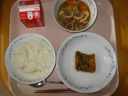今日の給食は,『ごはん・牛乳・ほっけのたつたあげ・八宝菜』です。